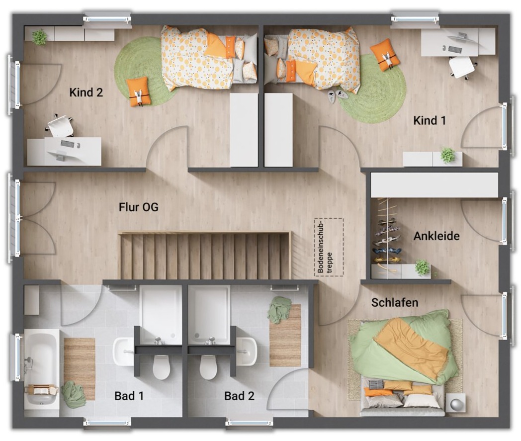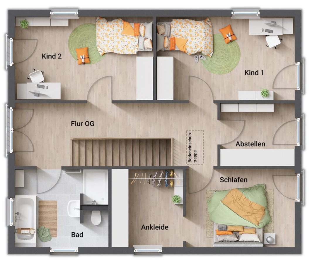 - Eltern- und Kinderbereich im Obergeschoss getrennt durch den Flur