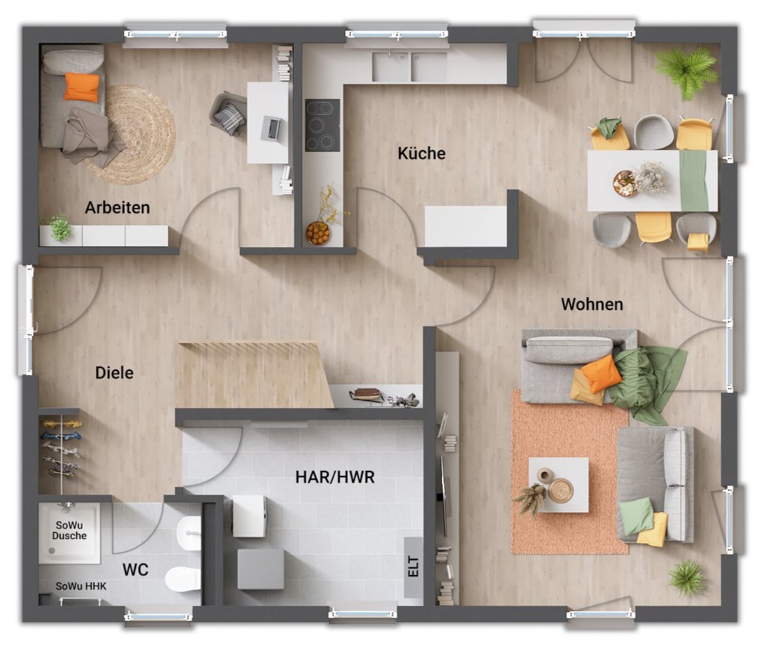 - aufgeräumtes/cleanes Erdgeschoss (Trennung des „technischen“ Bereichs (Hausanschlussraum, WC, Arbeit) vom „gesellschaftlichen“ Bereich (Wohnen, Kochen)
