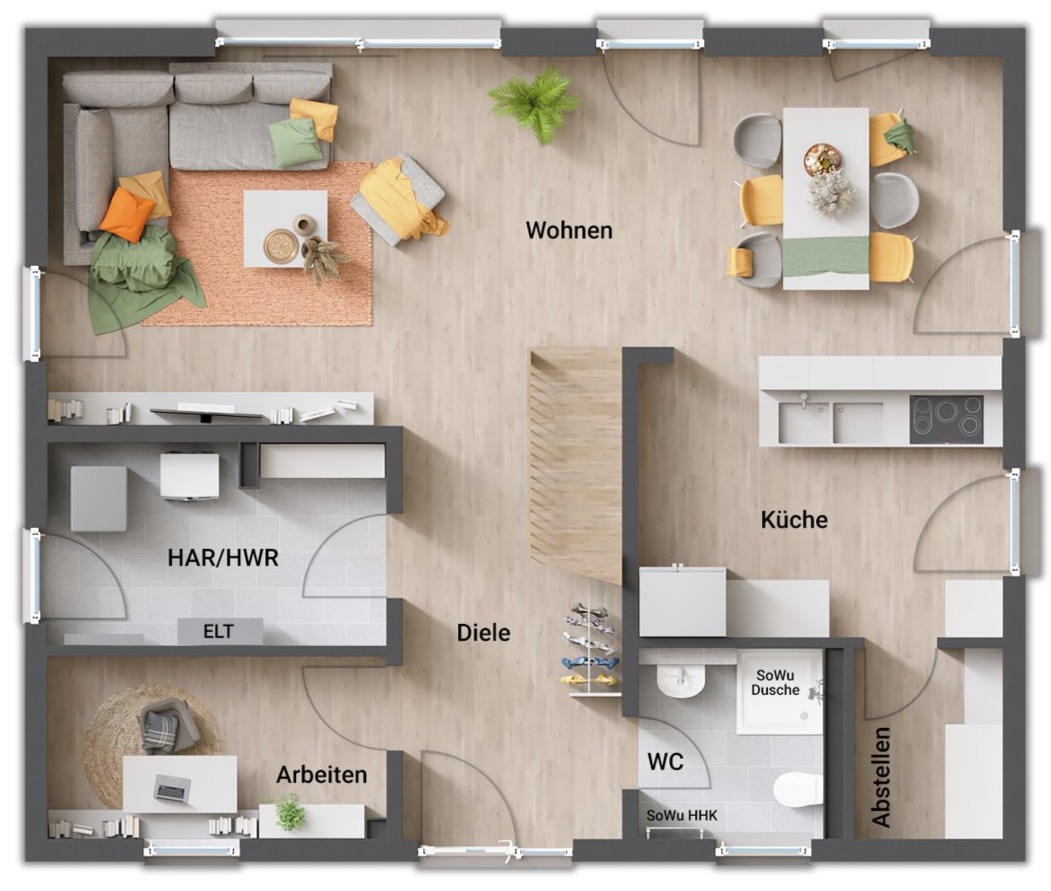 - gerade Treppe (zentral im Erdgeschoss, „teilt“ Koch- und Wohnbereich)