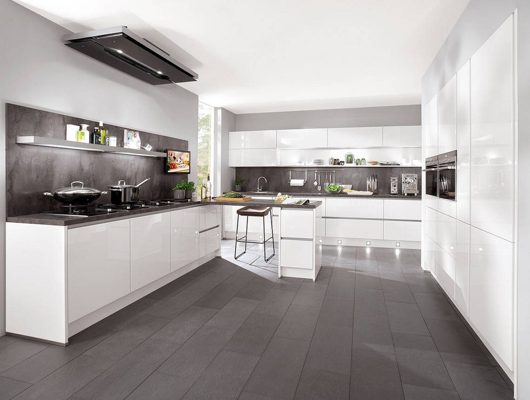 In dieser modernen Küche für stilsichere Paare bleiben keine Wünsche offen. Eine elegante Hochglanz-Küche in Weiß trifft auf allerfeinste Technik, die einer Profi-Küche gleich kommt: Eine Kombination aus Gasherd, Teppan Yaki und Grill ist einzigartig und lädt zum genussvollen Kochen für Freunde ein. Die vielen grifflosen Auszüge bieten ausreichend Platz für alle Küchenhelfer und ein praktisches Plätzchen zum Arbeiten ist mit dem kleinen Tresen gegeben. Ein echter Eye-Catcher ist die Beleuchtung in der Sockelleiste, die der Küche ein schönes indirektes Licht verleiht.