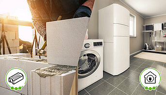 Die Town & Country Haus Vollausstattung setzt auf den Neubaustandard „Effizienzhaus GEG 2023“ und ermöglicht Ihnen als Bauherr bereits heute den Neubaustandard von morgen, ohne Mehrkosten. Denn in der Vollausstattung ist bereits eine Luft-Wasser-Wärmepumpe, eine Fußbodenheizung sowie eine Photovoltaik-Vorrüstung inklusive. Denn den Primärenergiebedarf von 55 % des Referenzgebäudes können Sie mit einer eingebauten Luft-Wasser-Wärmepumpe erreichen.